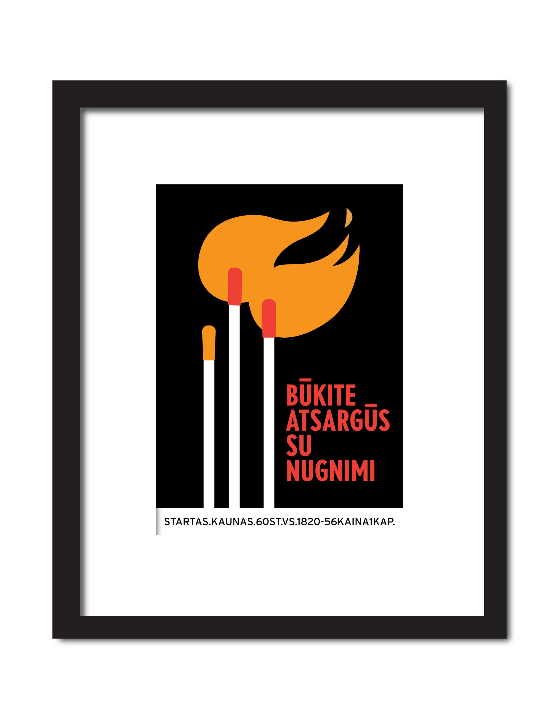 A colorful hand-pulled screen print of a vintage Lithuanian matchbook cover warning of fire/drought conditions